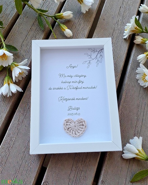 Szülőköszöntő ajándék képkeret - horgolt szív