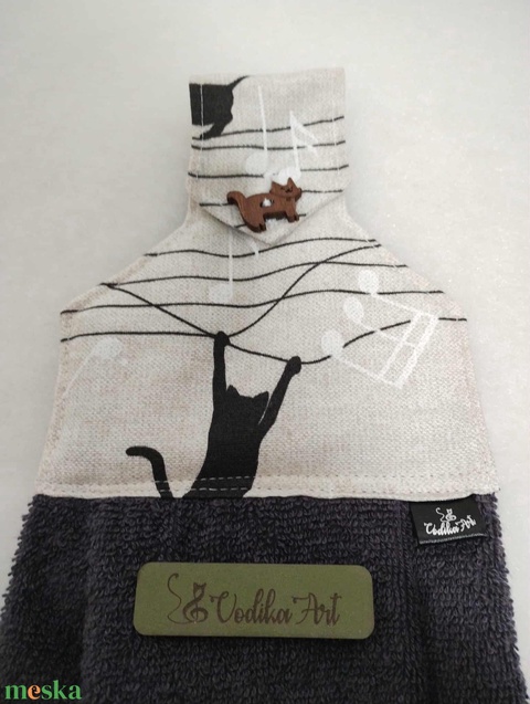 Konyhai kéztörlő, cicus rosszalkodik a kottában