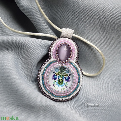 Egyedi hímzett medál színes kásagyöngyökkel, macskaszem és virágos üvegkabosonnal