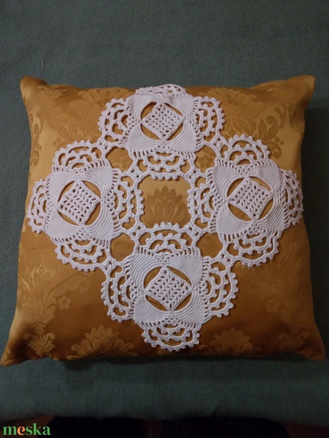 40 cm x 40 cm selyem párna ekrü színű csipke rátéttel díszítve.