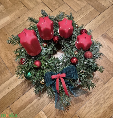 - Anyaga: élő fenyő, szalag, karácsonyi disz, masni, gyertya, moha