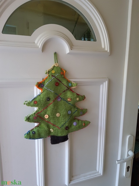 29x32 cm magas az ajtódísz, gombokkal díszítettem. Kétoldalas, nem egyforma a díszítés, ezt a mintán is láthatjátok. A gombok szimbolizálják a díszeket, az oldalvarrás az égőket, a középső díszítés pedig a szerpentint. A csúcs sem maradhatott le. A szaloncukrot nem tettem rá, mert általában nem egy tartós dísz.