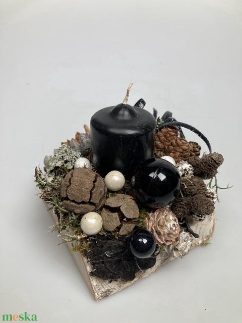 Fahasábra készült asztaldísz matt fekete tönkgyertyával, termésekkel és kellékekkel gazdagon díszítve (FX-08)