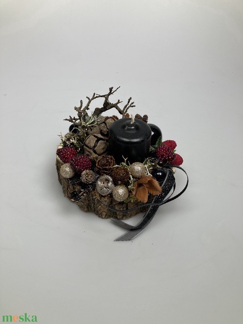 Fahasábra készült asztaldísz matt fekete tönkgyertyával, termésekkel és kellékekkel gazdagon díszítve (FX-09)