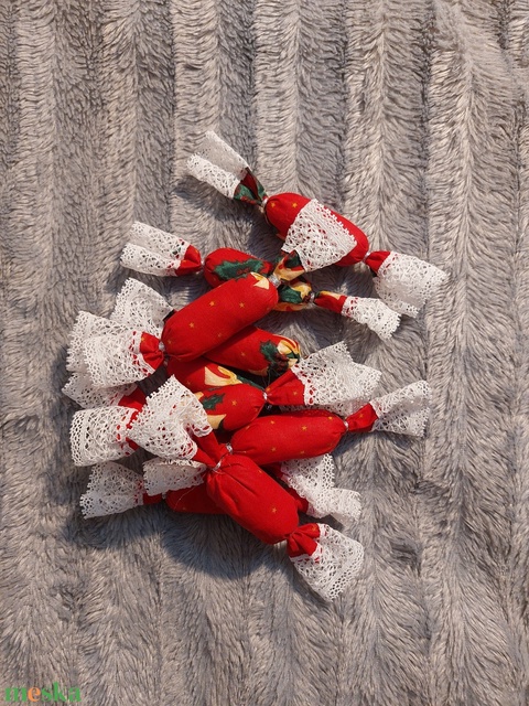 Piros, karácsonyi mintás textil szaloncukor csomag, 10 db-os, új