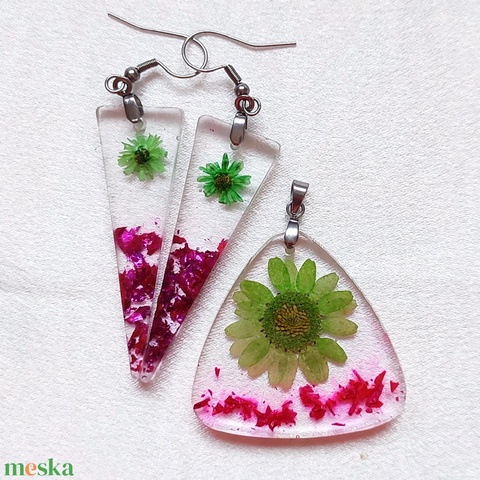 Magenta Zöld Műgyanta Ékszerszett Valódi virágokkal és pink füstfóliával