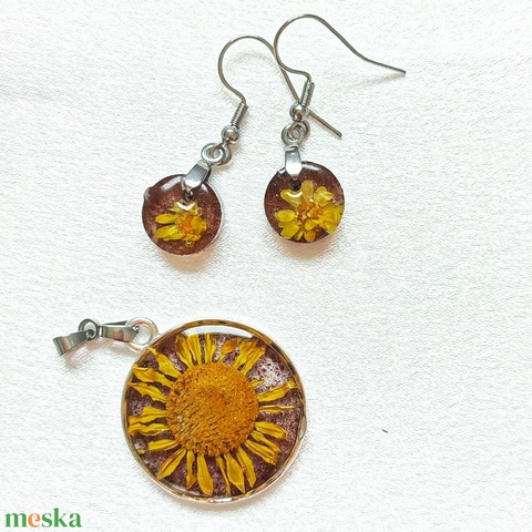 Napfényes Életöröm - Sárga virágos kör medál és fülbevaló műgyantában sötétbarna alapon
