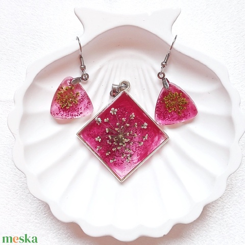 Bájos Rózsaálom Ékszerszett - Gyanta medál és fülbevaló préselt virágokkal