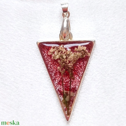 Tűz és Csillogás - Vörös csillámos, háromszög medál fehér virágokkal