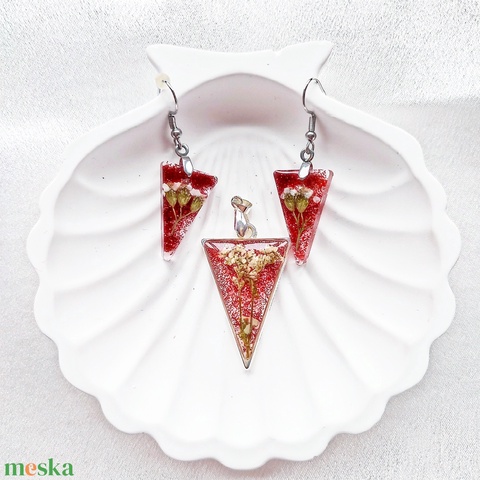 Tűz és Csillogás - Vörös csillámos, háromszög medál fehér virágokkal fülbevalóval