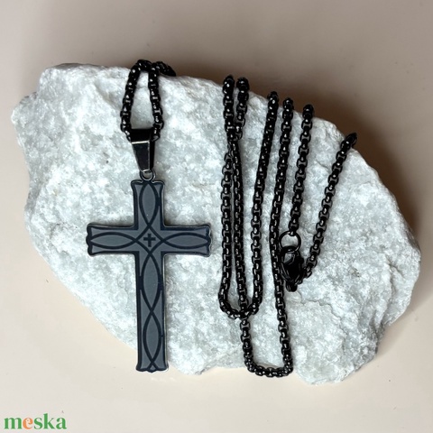 Fekete nemesacél lézergravírozott mintás kereszt medálos nyaklánc amulett ajándékdobozban 5673038