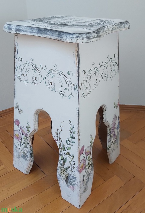 - Anyaga: mdf hokedli, rizspapír, krétafesték, akril festék, antikoló festék