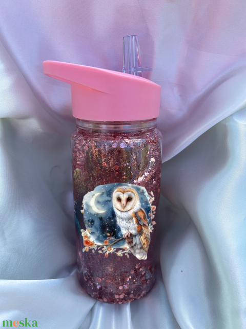 Mozgó csillámos kulacs baglyos iskolakezdésre, óvodába, szülinapra vagy csak úgy