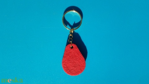 Piros filces kulcstartó csepp formájú fa alappal. Élénk, figyelemfelkeltő posztó hatású felülettel.