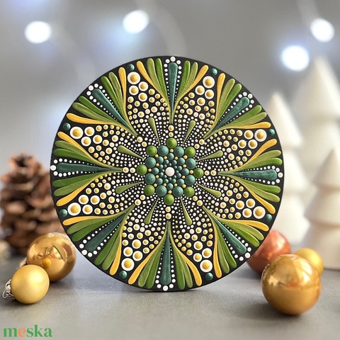 Aranyló zöld és arany mandala hűtőmágnes (13,5 cm) – Elegáns kézzel festett dísz