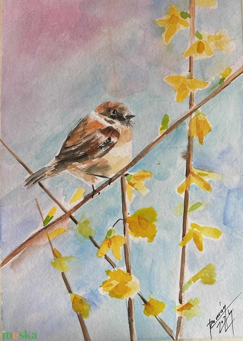 "Veréb aranyesővel" Eredeti akvarell festmény, veréb