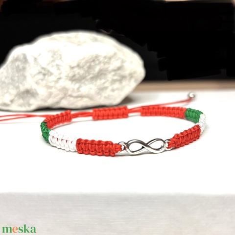 Magyar nemzeti színű csomózott karkötő végtelen jel medállal 5674827