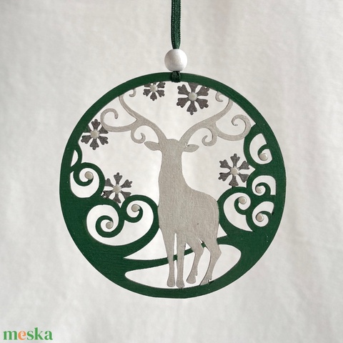 Téli szarvas gyöngyház fehér és zöld kézzel festett karácsonyfadísz