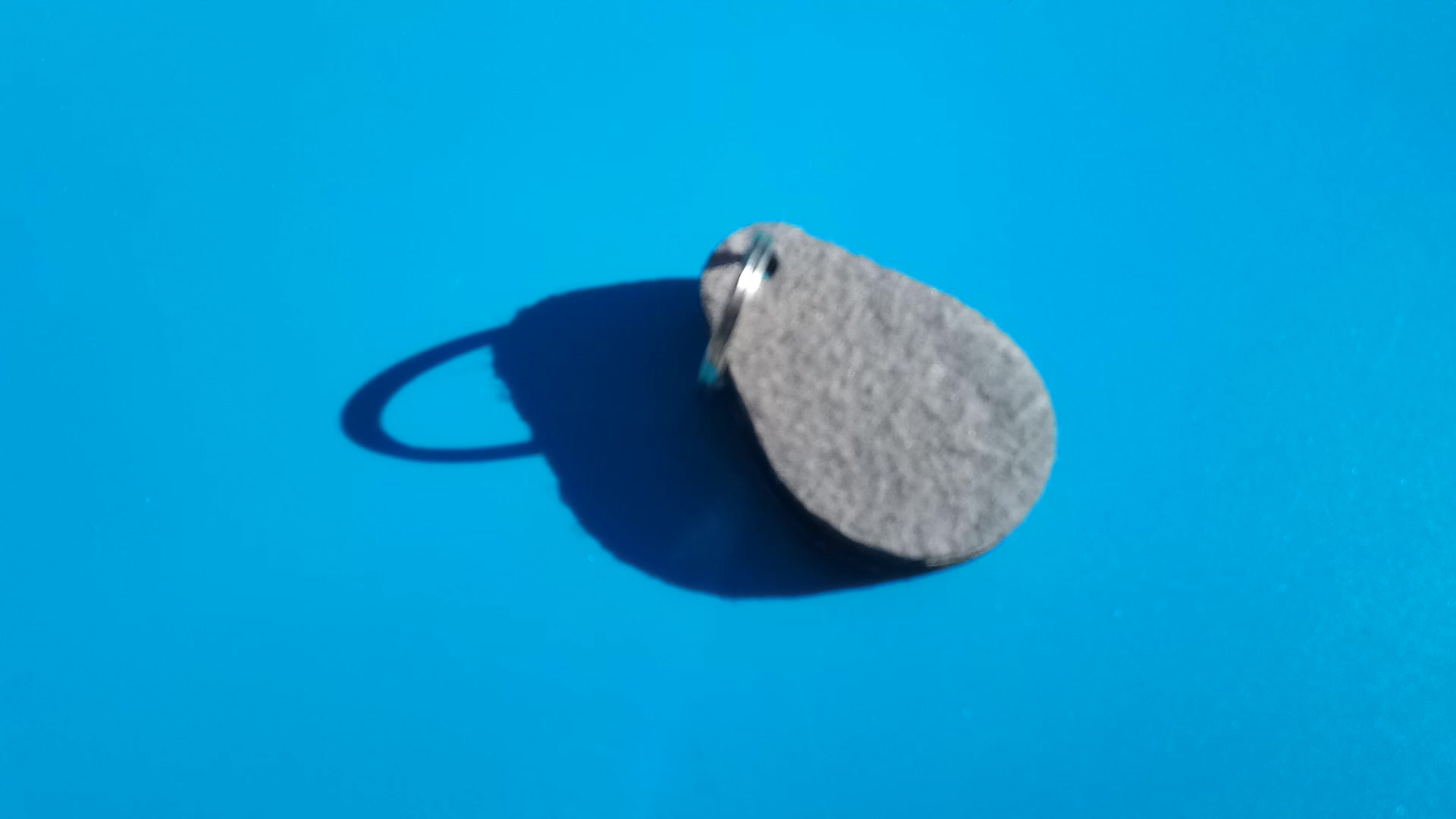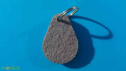 Szürke filces kulcstartó csepp formájú fa alappal. Visszafogott, minimalista posztó hatású felülettel.