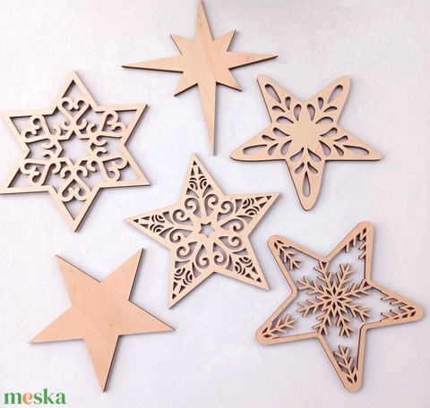 Ünnepi csillag szett – 6 darab lézervágott, díszes fa dekoráció (15 cm)