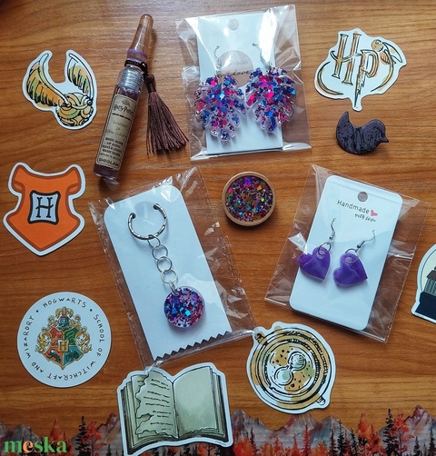 - Anyaga: műgyanta, csillám, pigmentpor, nikkelmentes fém, rézlap, zománcfesték, szájfény, fa alap, matricák