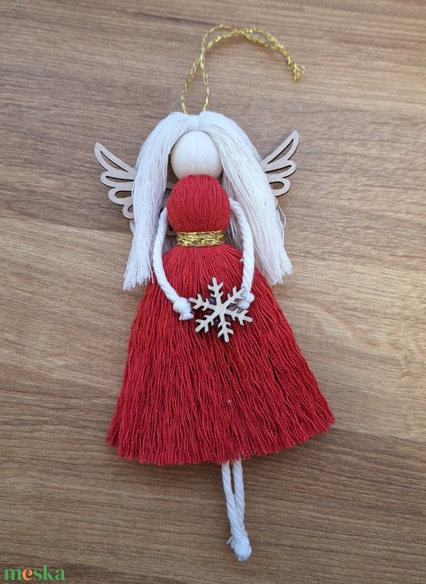 Piros makramé angyal, karácsonyfadísz