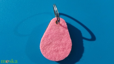 Rózsaszín filces kulcstartó, csepp formájú fa alappal. Finom, bájos posztó hatású felülettel.