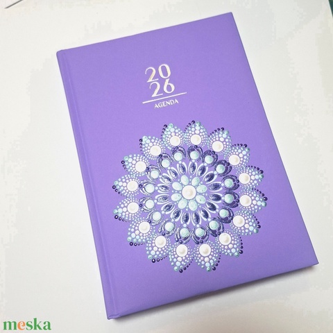 Pontozott mandalás határidőnapló, 2026-os, lila, kék és fehér mintával