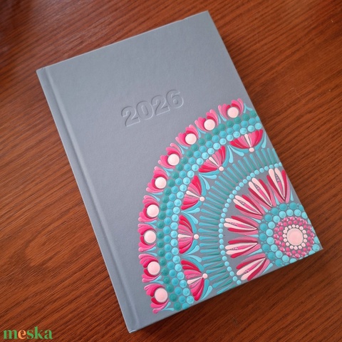 Pontozott mandalás határidőnapló, 2026-os, szürke, kék és pink mintával