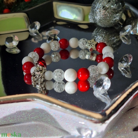 - Anyaga: gyumidamil, hegyikristály, jáde, piros sapkás maci charm, ezüst színű nemesacél hópehely charm, fehér kalcedon