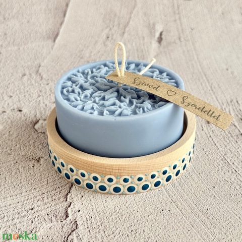 Kézműves gyertya fa tálkában, kék szójaviasz dekoráció virág / falevél mintával