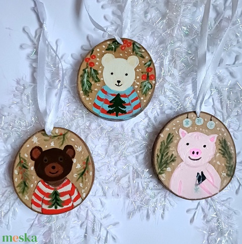 3 db bohém, téli állatos, fára festett rusztikus kép, dísz. Maci, medve, jegesmedve, malac