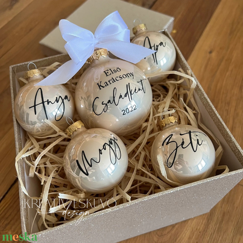 Családi szett karácsonyi üveggömb, feliratos karácsonyi üveg gömb dísz, karácsonyfa dísz
