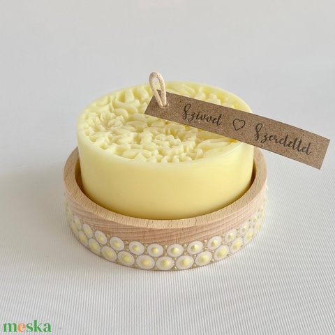 Kézműves gyertya fa tálkában, sárga szójaviasz dekoráció virág / falevél mintával