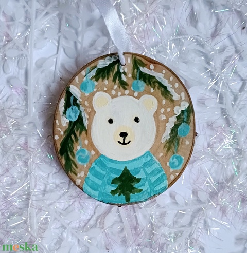 Bohém, téli állatos, fára festett rusztikus kép, dísz. Jegesmedve, jegesmaci, 2 oldalas
