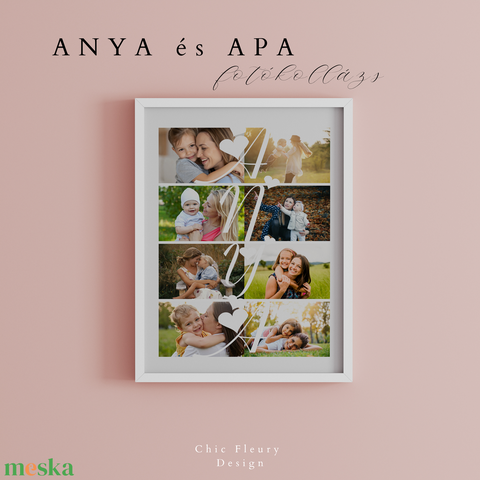 A kollázs az adott felirat (ANYA / APA) betűit és a saját fényképeidet ötvözi egy harmonikus, letisztult elrendezésben.