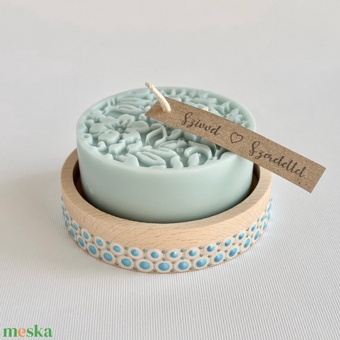 Kézműves gyertya fa tálkában, jégkék szójaviasz dekoráció virág / falevél mintával