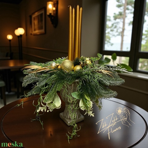 Arany gyertyás ünnepi asztaldísz – talpas váza