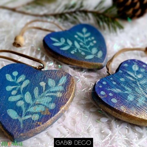 3 db elegáns, fára festett téli, karácsonyi rusztikus szív alakú dísz, dekoráció