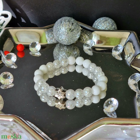 - Anyaga: gyumidamil, hegyikristály, ezüst színű nemesacél hópehely charm, aurakvarc, kagylógyöngy, jáde