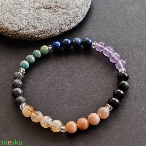 ametiszt, lápisz lazuli, hegyikristály, gumiszál, citrin, holdkő, apatit, zöld kianit, szivárvány obszidián