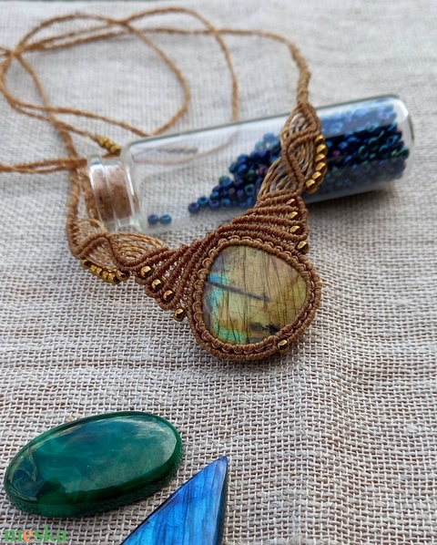 - Anyaga: linhasita viaszolt szál, labradorit ásványkaboson, japán kásagyöngy
