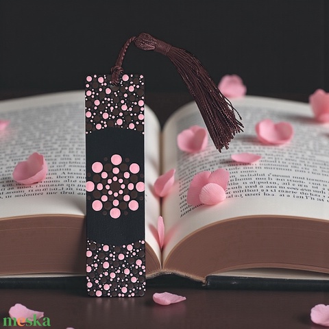 Fa könyvjelző barna és rózsaszín pontmandala díszítéssel, selymes bojttal, 3,2x12x0,15 cm