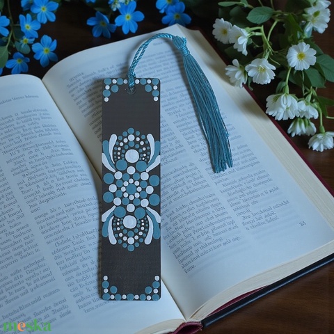 Fa könyvjelző jégkék és “nyílt tenger” kék pontmandala díszítéssel, selymes bojttal, 3,2x12x0,15 cm