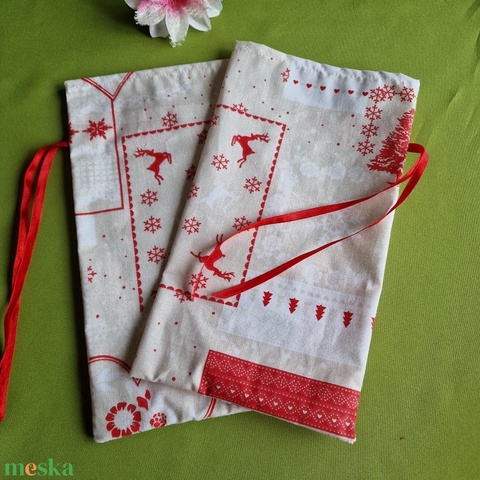DCS90 - Hópehely, szív, szarvas mintás mikulás zsák, textil ajándéktasak