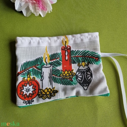 DCS94 - Gyertyák és gömbök fenyő ágon mintás textil ajándéktasak, mikulás zsák