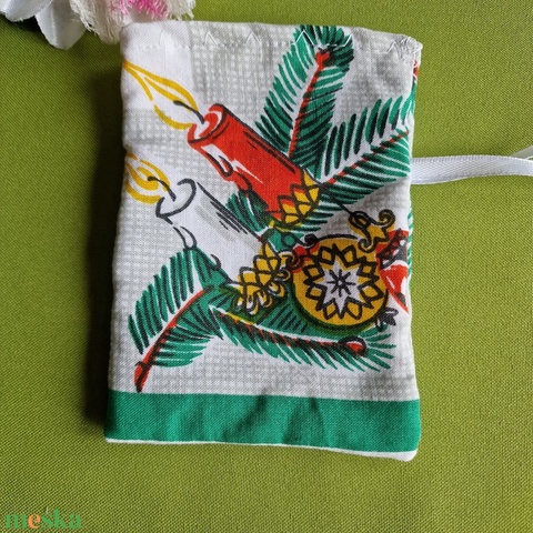 DCS95 - Gyertyás, gömbös mintás textil ajándéktasak, kis mikulás zsák