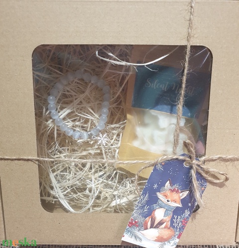 Karácsonyi ajándékdoboz, illatviasszal és macskaszemes karkötővel hópihe charmmal