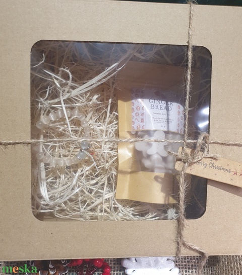 Karácsonyi ajándékdoboz, illatviasszal és macskaszemes karkötővel mézi charmmal