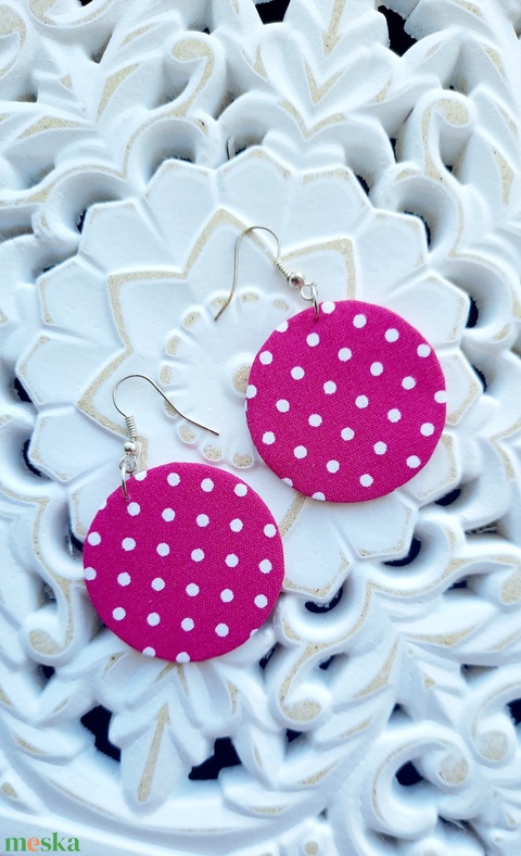 Magenta alapon fehér pöttyös textilből készült kör fülbevaló, ami pehely könnyű, így nem terheli meg a füled. Karton lappal készült, ami a tartást biztosítja. Szilikonos stopperrel küldöm.